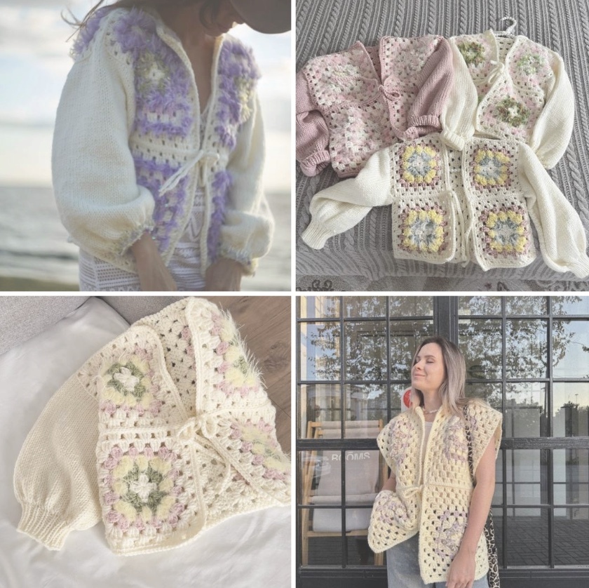 По МК вы сможете связать три изделия на детские или взрослые размеры: Жилет, кардиган полностью из квадратов, Кардиган с рукавами спицами