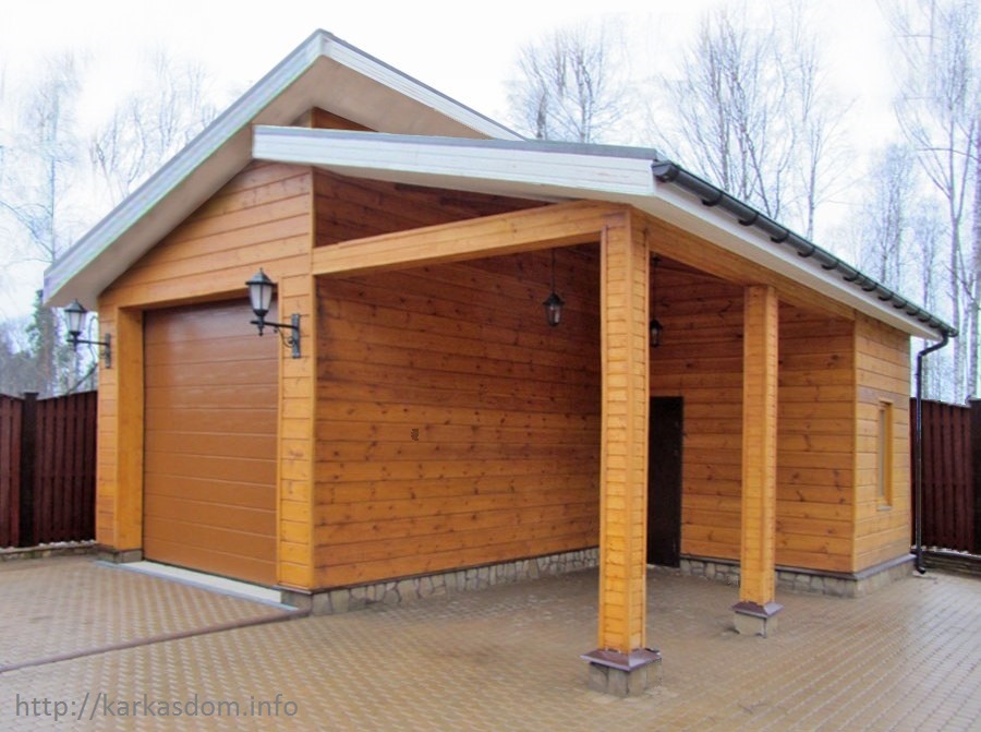 Каркасный гараж 7х7 49м2 : Высота потолков 2,3м, Закрытая часть 32м2, Открытая часть 17м2, высота в коньке 4,1 (4,3)м.