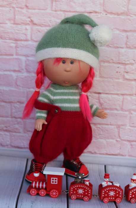 Комплект состоит из комбинезона-имитации кофточки в полоску и штанишек на лямочках, длину штанин можно регулировать по своему вкусу и колпачка нового фасона с большим помпоном.