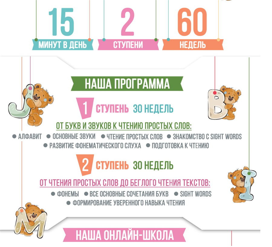 Основные темы: чтение фонем, всех основных сочетаний букв, sight words, формирование уверенного навыка чтения