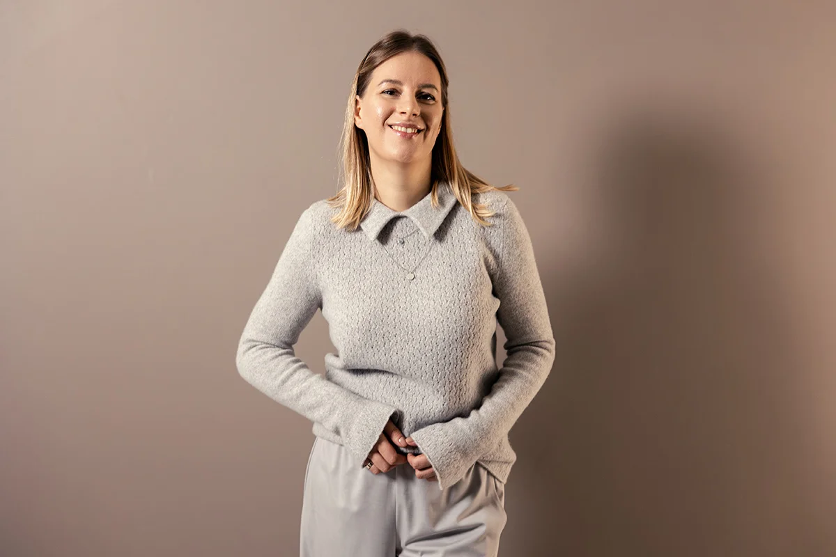 Модель 2 оформлена резинкой 1/1 по всем деталям. Воротник распашной «а-ля поло».