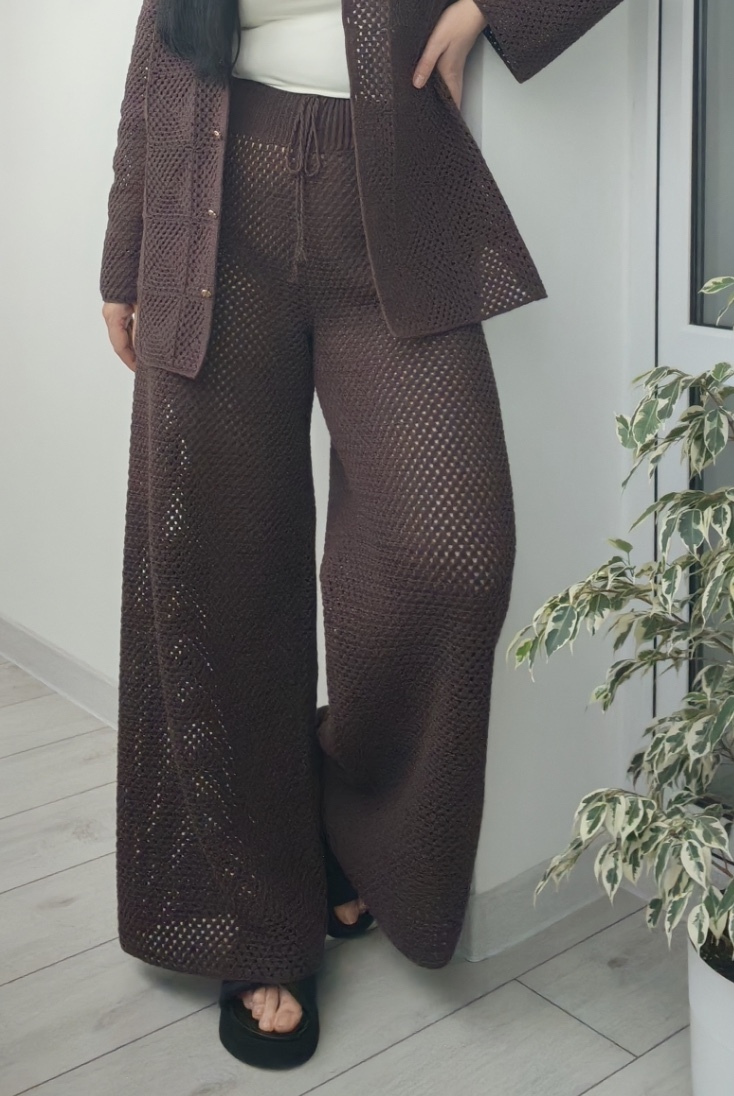 Брюки палаццо, широкие книзу от бедра. Вяжутся сверху вниз. Задняя часть у брюк выше передней. Боковых швов нет. Широкий пояс с кулиской под шнурок. В МК есть рекомендации, как связать классический вариант брюк (зауженные к низу).