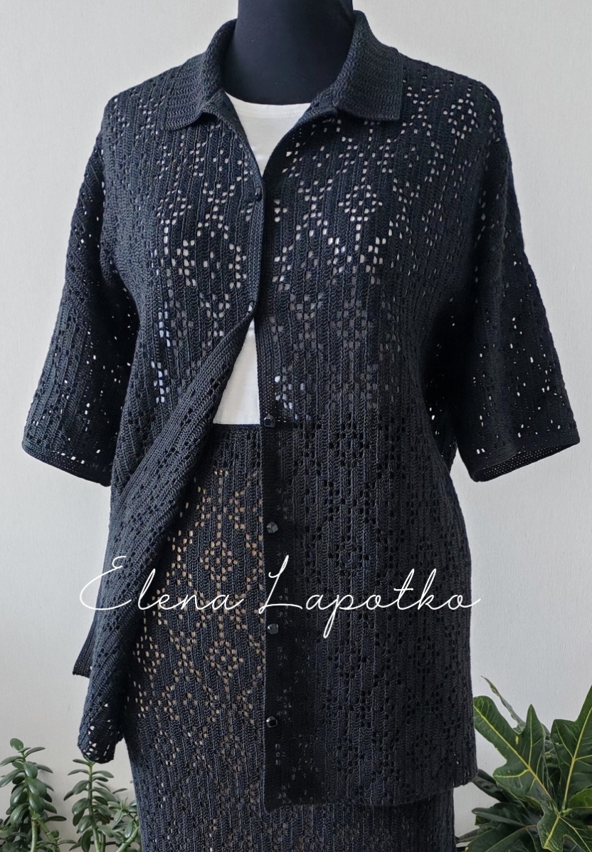 Формат МК PDF + видеоуроки. Рубашка связана в технике поперечного вязания филейным узором. Состоит из отдельных деталей (спинка, перед, рукава), свободный силуэт- оверсайз. Спущенное плечо. Уровень сложности: выше среднего.
