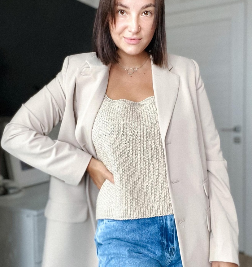 Предлагаю связать женский базовый то-жилет с поперечным крючком. Можно носить как топ к телу или второй слой на футболку, рубашку, водолазку.