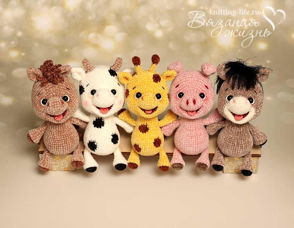 вяжем крючком лошадку, ослика, хрюшку, корову и жирафа