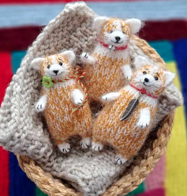 Описание вязания спицами маленьких корги. Вязание круговое и поворотными рядами. Собачки на фотографиях ростиком 9-10 см связаны из пуха норки. Обучающих материалов в МК нет. Есть много фотографий процесса. Уровень сложности — средний. Файл в формате pdf.