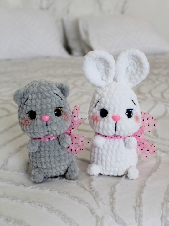 Размер игрушки: 15 см (зайчик); 12 см (котик).