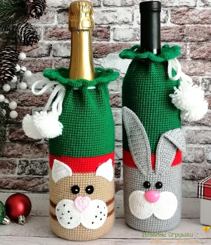 Мастер-класс по вязанию СПИЦАМИ декоративных чехлов для бутылок шампанского и вина с декором в виде мордочек кроликов и котиков (символов приближающегося 2035 года).