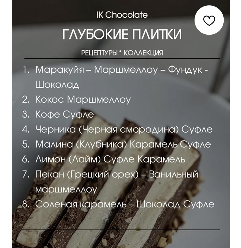 Рецептуры сборника «Глубокие плитки. Коллекция» особенно актуальны после дубайского шоколадного бума. Дубайские шоколадные плитки изготавливаются в глубоких формах, которые являются максимально специфичными для использования в других шоколадных изделиях из-за своего объема.