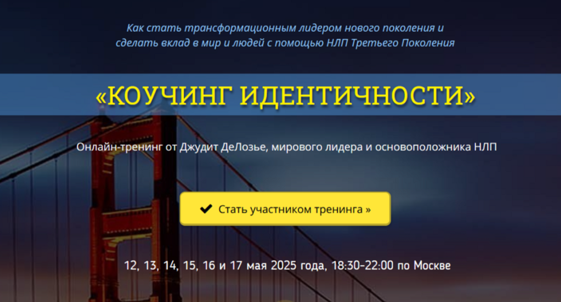 Таких людей в каждой профессии можно в буквальном смысле пересчитать по пальцам одной руки. НЛП — не исключение. Вам крупно повезло, поскольку кто как не Джудит, являясь основоположником направления, имеет полное право и действительно может раскрыть столь трудную тему в полном объеме.