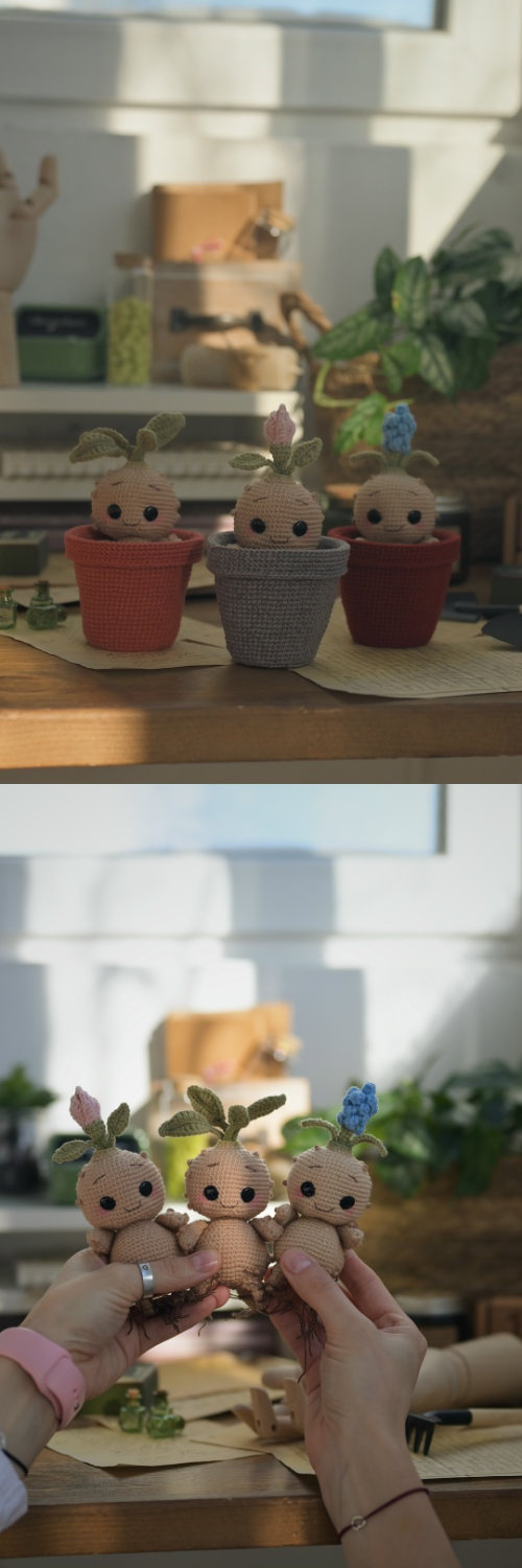 Файл содержит пошаговое текстовое описание с фотографиями алгоритма создания игрушки — ростка с тремя вариантами растительной части и горшочек.