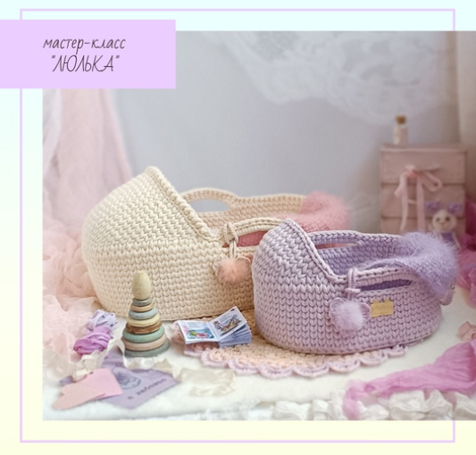 МК содержит описание процесса вязания люльки в двух размерах и двух материалах с уже готовым деревянным дном размером 30*20 см и 20*15 см с комплектом аксессуаров;