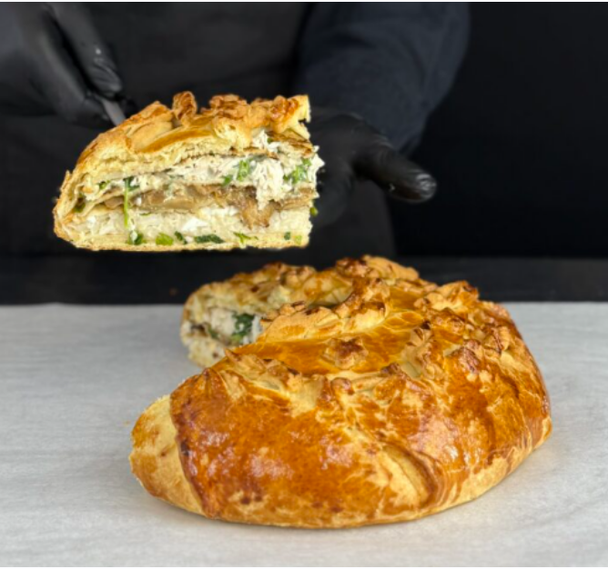 В нём есть всё: и вкусное дрожжевое тесто быстрого замеса, и нежные блины по фирменному рецепту, и сочнейшая слоёная начинка из курицы, грибов и риса.