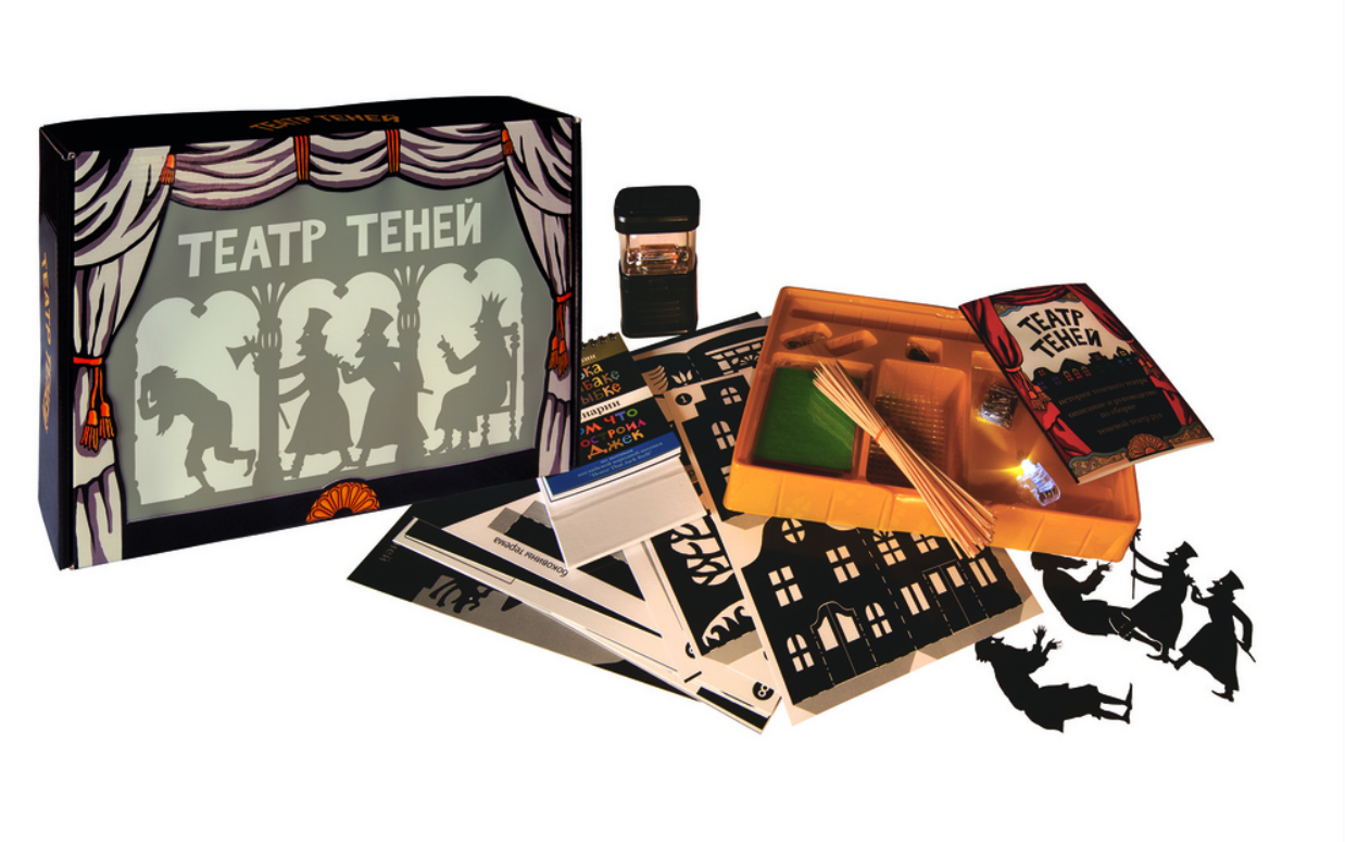 Театр теней — волшебный мир, где тени оживают и становятся актерами. Такой театр в чемоданчике понравится как ребенку, так и взрослому человеку. Можно устроить настоящий спектакль по сценарию, который уже есть в наборе или придумать и написать свой сценарий.
