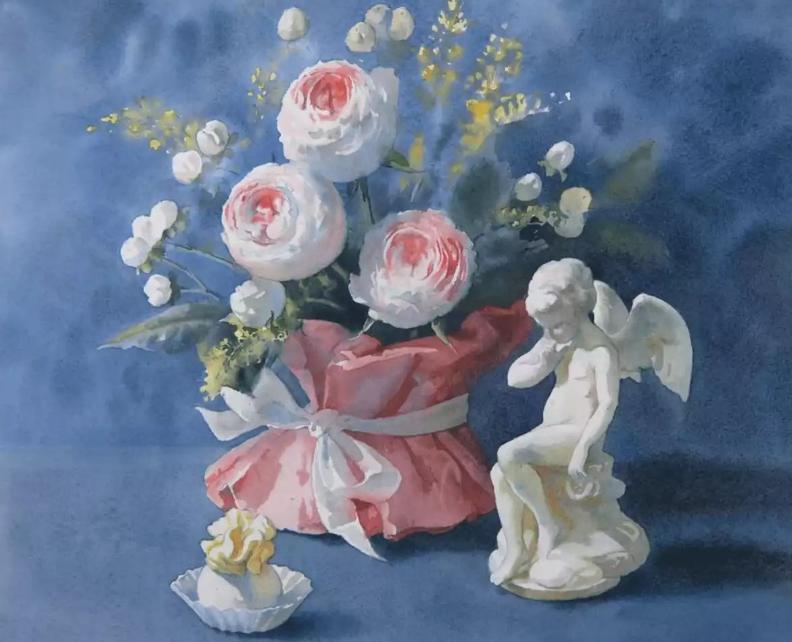 Идея сделать такой мастер-класс родилась благодаря просьбам студентов, которые хотели научиться писать лессировками. В сюжете натюрморта позируют нежные розовые розы, мраморная статуэтка Амура и десерт: белое безе со сливочной розочкой. Тема вполне в духе рококо, как будто из будуара маркизы Помпадур! Все в композиции создает игривое, веселое, весеннее настроение, и дает отличный повод поупражняться в технике лессировок в акварели.