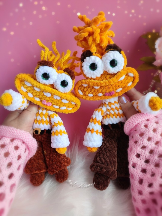 По этому описанию вы свяжете Тревожность из мультика Головоломка 2. Тело цельновязаное, пришиваются голова, глаза и причёска.