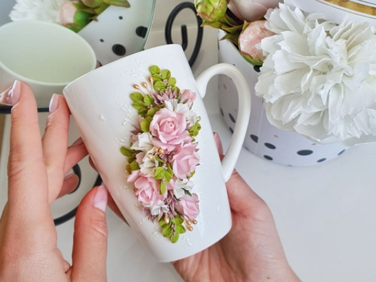 Научитесь лепить миниатюрные розы и бутоны для декора чашки, тонкие веточки, и другие элементы декора как на фото