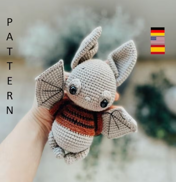 Нужна пряжа . • Летучая мышь. 80 г хлопковой пряжи (104 м/50 г). • Белки глаз. Небольшое количество пряжи белого или светло-серого цвета. • Шарф. Хлопковая пряжа 18 г (104 м/50 г) • Свитер. Небольшое количество пряжи 2-х цветов. Дополнительные материалы. • Крючок размером 2,5 мм и 4,00 мм (для шарфа) • Безопасные глазки размером 12 мм • Гобелен/швейная игла для сшивания частей тела • Черная пряжа для вышивки бровей • Полифайбер=наполнитель • Розовые/красные румяна и кисть • Дополнительно: темно-серые тени для век и мини-кисть для макияжа глаз • Дополнительно: маленькая пуговица для шарфа. Размер. При использовании аналогичной или такой же пряжи с тем же размером крючка, летучая мышь будет ок. 23 см высотой.
