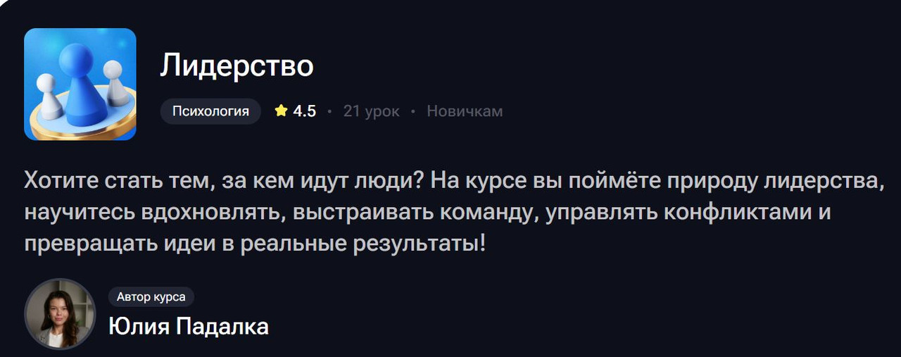 21 занятие с Юлией Падалко — это не теория из книжек, которую вы и так читали, и не вебинары в стиле «10 секретов успешного лидера» ( секретов нет, есть работа). Это живой опыт человека, который вырастил сообщество в 2000+ человек, работает с корпоративными клиентами и знает, как устроено лидерство изнутри — со всеми его радостями, косяками и моментами «а что я вообще делаю».