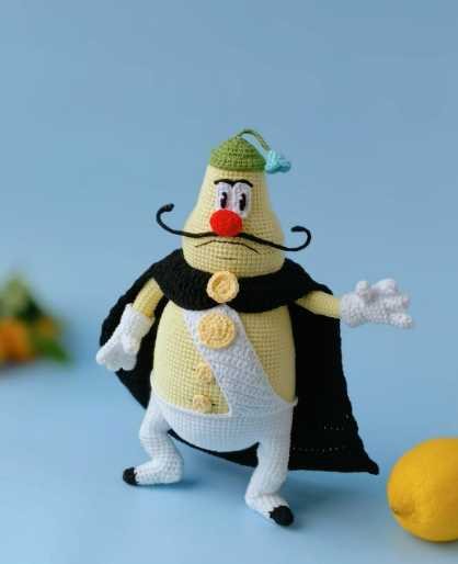 Мастер-класс «Лимон» Высота 23см. Каркасная игрушка Материалы: *Пряжа (55% хлопок, 45% акрил) 50г/160м. YarnArt Jeans: Основной цвет — лимон (67), на медаль, пуговицы- желтый (88), на шапочку- зеленый (69), нос- красный (90), штаны, лента, глаза- белый (62), колокольчик- голубой (76) и плащ-черный (53) цвет. *Нитки Мулине черного цвета. *Крючок 1,75. *Проволока флористическая 1,2 мм (5шт.) или 1,5 м. *Лейкопластырь. *Игла для сшивания. *Ножницы. *Холлофайбер. *Клей ПВА.