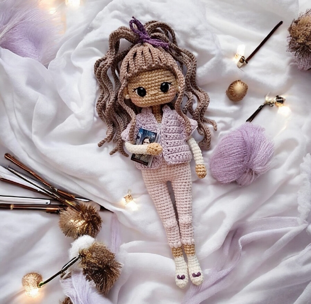 МК очень подробный (PDF — формат). Куколка полностью на каркасе, может принимать различные позы на полке, читая книжку в свое удовольствие. Также, в комплект к Лирочке входит схема на ее любимого питомца — котеночка. Куклену можно вязать в различных цветовых решениях: новогоднюю, весеннюю, летнюю, осеннюю или других цветах, не относящихся к сезонам. Скоро в видеообзоре покажу вам и других девочек. Размер куколки 29 см. Необходимые материалы: 1. Пряжа YarnArt Jeans; 55% хлопок, 45% полиакрил; 50 гр / 160 м. Можно заменить на Alize Cotton Gold; 55% хлопок, 45% полиакрил; 100 гр / 330 м. Эти два аналога пряжи можно вместе соединить (по выбору оттенков для куколки), но для вязания тела (рук и ног) рекомендую использовать нить от YarnArt Jeans. Она немного потолще, соответственно будет удобнее вставлять каркас. Оттенки (использовала в МК из YarnArt и Alize): 07 – основной цвет тела; 01 – белый (носочки, кофточка и мордочка котенка); 75 – голубой (лосины); 33 – розовый (жакет, повязка и вышивка на носках); 26 – коричневый (волосы, ушло 20 гр); 80 – серый (основной цвет котенка). 2. Крючок 2,0 мм. 3. Черные глазки на безопасном креплении 9 – 10 мм (у меня 10,0 мм). 4. Черные глазки — полубусины 4,0 мм (для котенка). 5. Клей для приклеивания глаз – полубусин. 6. Медная проволока 1 мм (арт. 180732448). 7. Лейкопластырь / малярный скотч для фиксации каркаса. 8. Тонкая черная нить для вышивки ресничек. 9. Белая нить для вышивки белков глаз. 10. Тонкая розовая нить для вышивки носика котенку. 11. Тонкая прочная нить для выполнения утяжек. 12. Бусины (сережки) 5,0 мм (2 шт). 13. Наметочные булавки. 14. Румяна или сухая пастель для тонирования щечек. 15. Книжная миниатюра 3,5 х 2,3 см (арт. 252813911). Можно приобрести книгу большего размера, но не меньше, чем у меня указано. 16. Холлофайбер. 17. Ножницы. 18. Игла. 19. Маркер для вязания. Хочу обратить ваше внимание, мои МК не содержат уроков по вязанию крючком!