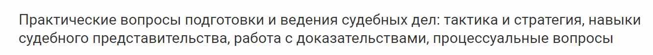 Специфика современного рынка труда требует от юриста, занимающегося судебным представительством и сопровождением судебных процессов, высокого уровня квалификации в области судебной стратегии, тактики, риторики, психологии, практических навыков сбора доказательств и работы с ними. Одновременно в настоящих условиях наблюдается постоянное обновление процессуального законодательства. Все это неминуемо ставит перед юристами вопрос о необходимости повышения квалификации в плане улучшения своих знаний процессуального права и приобретения эффективных практических навыков сопровождения судебных споров.