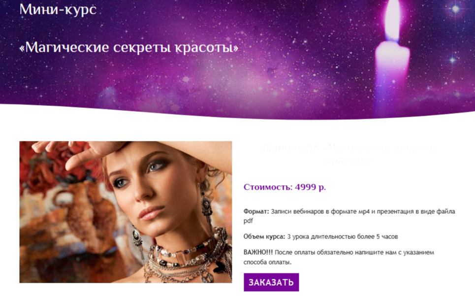 Мини-курс «Магические секреты красоты» создан по многочисленным просьбам моих учениц и клиенток. Три занятия включают в себя самые разнообразные магические, энергетические и древние методы омоложения.