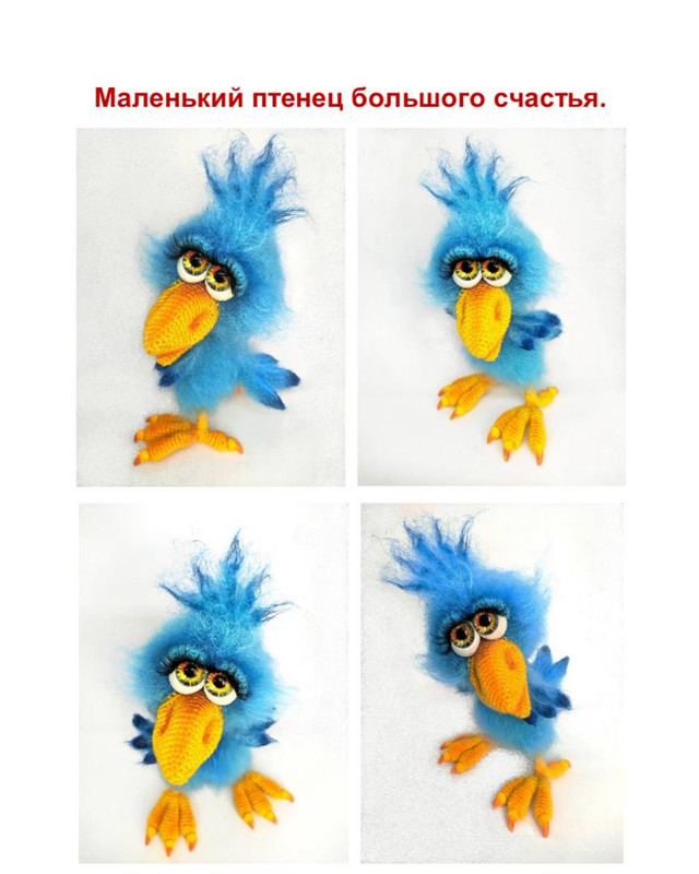 Ручной птенчик счастья на 27 страницах в формате PDF содержит подробное описание процесса вязания игрушки, лепки коготков, сопровождается множеством фотографий. Игрушка полностью на проволочном каркасе, что делает ее подвижной. Размер готовой игрушки зависит от толщины выбранной вами пряжи и индивидуальной плотности вашего вязания. Для вязания птички подойдет любая хорошо начесывающаяся пряжа.
