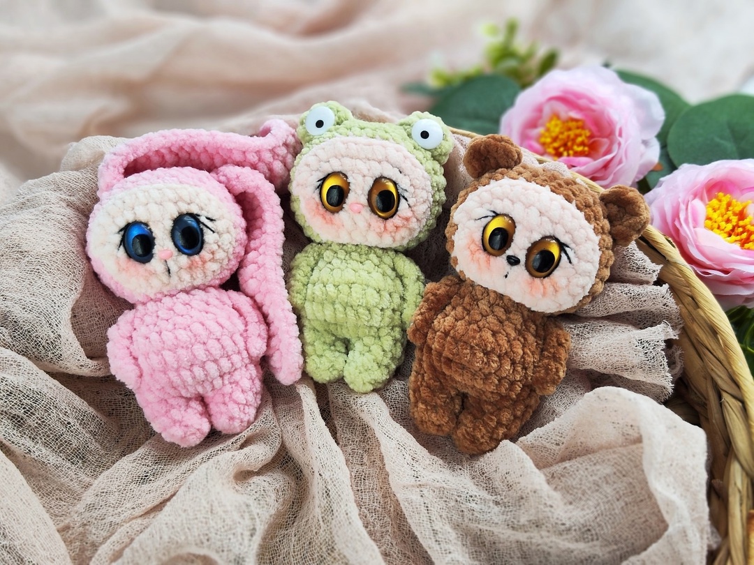 Игрушка вяжется одной деталью снизу вверх. Сначала вяжется тело, потом голова и тело ввязывается в голову. Хвостик, лапки и ушки ввязываются по ходу вязания тела. В мастер-класс входят все три игрушки. Пришивных деталей нет.