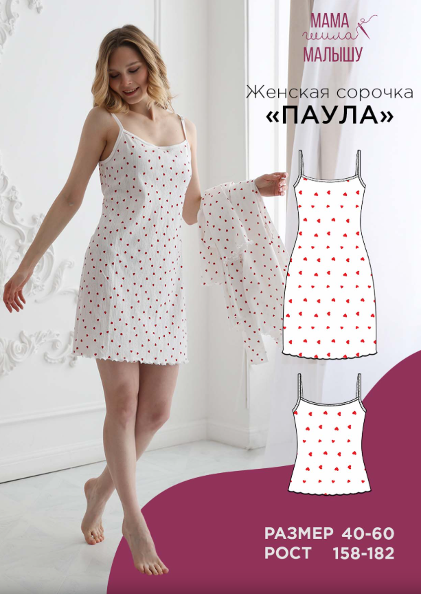 По одной выкройке вы сможете сшить как сорочку, так и удобную майку. Модель среднего объема идеально садится по фигуре, даря свободу движений и комфорт в течение всего дня. Сорочка «Паула» длиной чуть выше колена, а майка длиной до линии бедер. Горловина аккуратно обработана бейкой, что создаёт красивый и законченный вид изделия. Бретели на регуляторах также выполнены из бейки. Регулируйте длину бретелей под себя точно так же, как на нижнем белье. Это невероятно удобно и функционально! А теперь обратите внимание на низ изделия! Он обработан ролевым швом на оверлоке – вы только посмотрите на этот игривый, волнистый, воздушный край! Такая обработка придаёт модели особую романтичность и очарование.