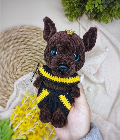 «Доберман» из рекомендованных материалов получается 15 см (без учета ушек). ВАЖНО! Размер готовой игрушки может отличаться от заявленного, если будут использованы другие материалы. Также размер зависит от плотности Вашего вязания.