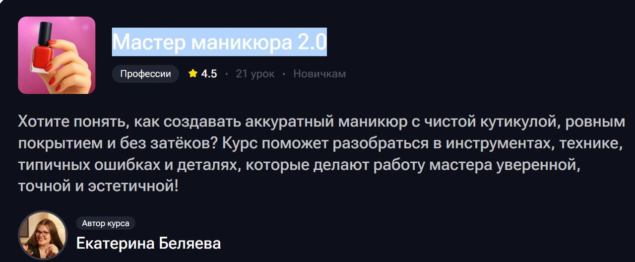 Если вы готовы перестать гадать и начать понимать — курс «Мастер маникюра 2.0» ждёт вас. Екатерина покажет не только «как делать», но и «почему именно так» — а это то самое знание, которое превращает старание в настоящее мастерство.