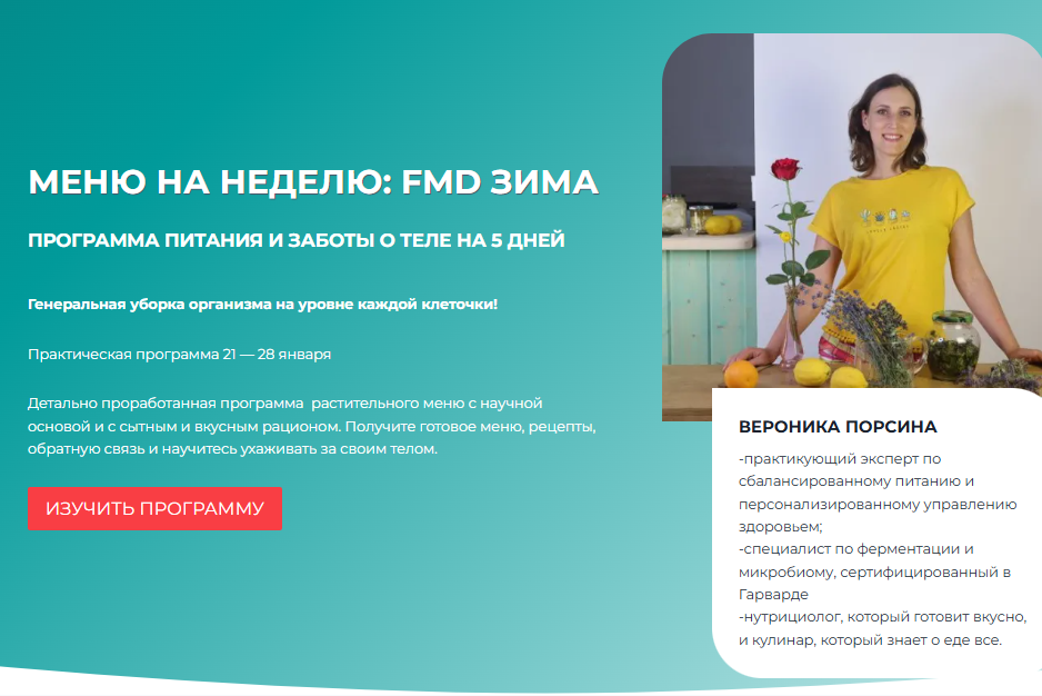 Разработанный специально для зимнего сезона курс “Меню на неделю: FMD зима” включает в себя всё необходимое для поддержания здоровья, стройности и комфорта в холодное время года. Этот формат сочетает в себе знания о питании, простые и вкусные рецепты, процедуры по уходу за собой, а также уникальную систему FMD (Fast Mimicking Diet) — для здоровья и красоты изнутри.