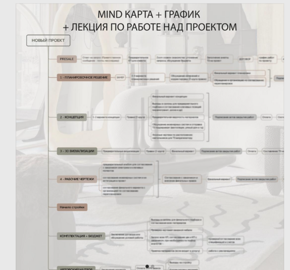 Это полная и подробная схема моей работы над проектом: все этапы от момента Presale до финала стройки. Выделены все ключевые точки контроля и согласований с командой проекта и заказчиком.