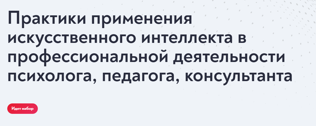 Курс «Практики применения искусственного интеллекта в профессиональной деятельности психолога, педагога, консультанта» разработан с учетом потребностей специалистов помогающих профессий, которым важно не только владеть теоретическими основами ИИ, но и уметь применять их в реальной практике.