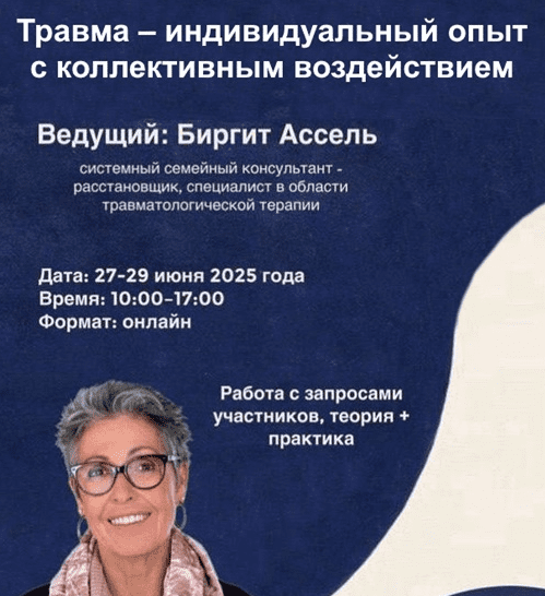 Впервые на русском языке! Международный семинар по работе с травмой и методу IoPT от Биргит Ассель, системного расстановщика, специалиста в травматологической терапии и коллеги Франца Рупперта. Уникальная возможность для русскоязычного пространства!