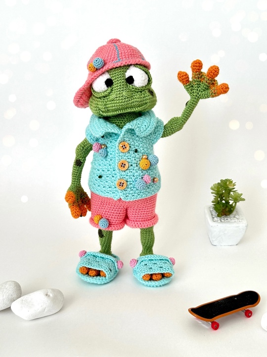 Внутри лягушонка есть каркас из алюминиевой проволоки, поэтому ноги, руки, шея, даже пальчики у него сгибаются. Он умеет не только самостоятельно стоять, сидеть, но и в руках держать нетяжелые предметы.