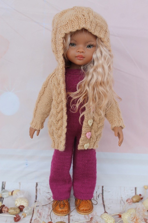 Комплект состоит из комбинезона и кардигана с аранами и капюшоном.