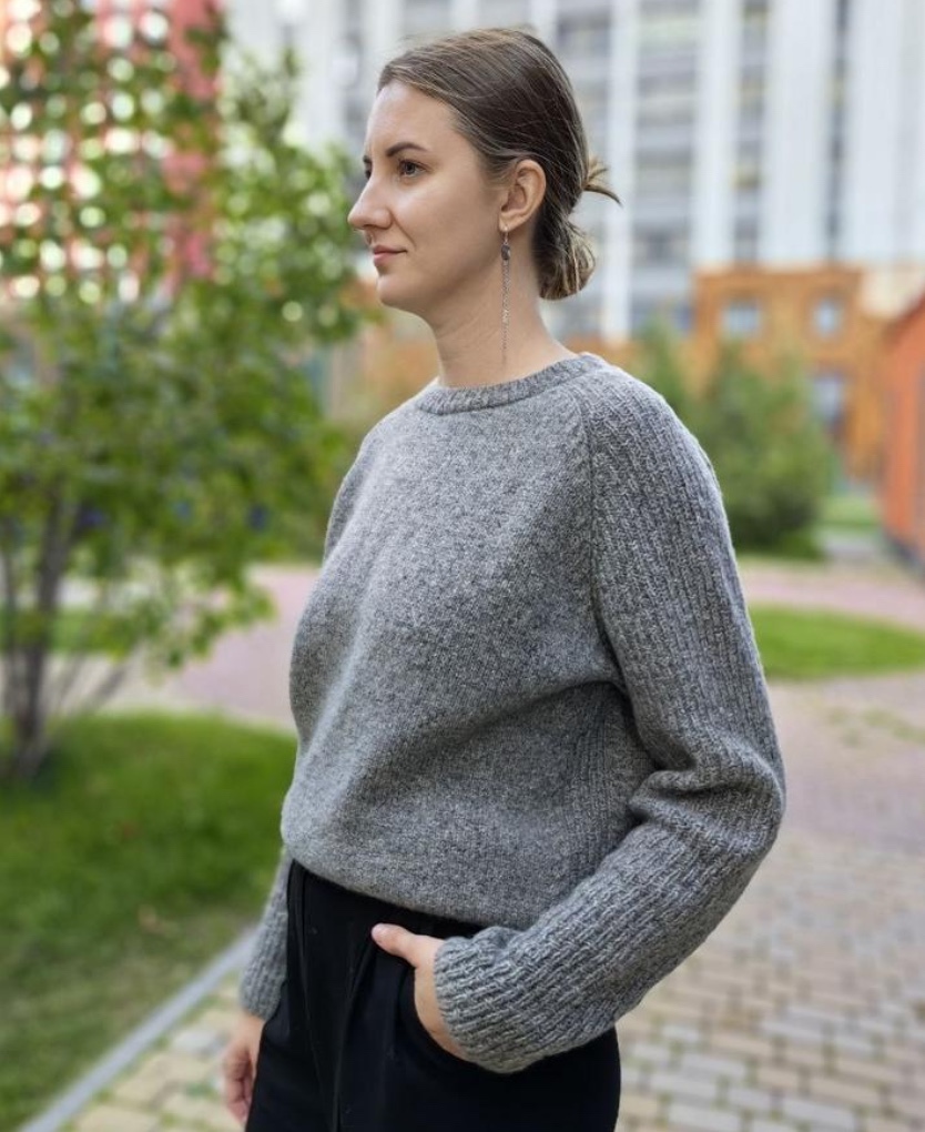 Классический реглан с одинаковым ритмом прибавок по корпусу и рукавам, вяжется сверху вниз без швов. По корпусу фактурные двойные прибавки, имитирующие убавки в изделиях фабричного производства; по рукавам двойные прибавки, которые вписаны в узор. Двойные убавки для сужения рукава вписаны в узор.