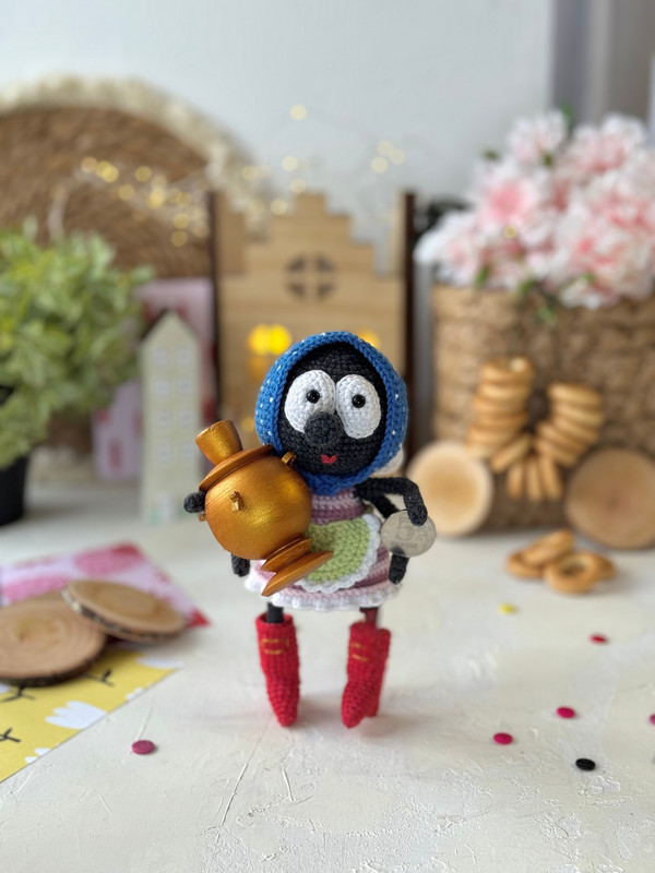 На стене старого дома уютно устроилась необычная гостья — муха Цокотуха, связанная чьими-то заботливыми руками. Её пушистые крылышки переливались нежнейшими оттенками бирюзы, будто хранившие тайну далеких океанов. Маленькие чёрточки глаз хитро щурились, наблюдая за жизнью двора, напоённого ароматом ромашек и теплом солнечного дня.