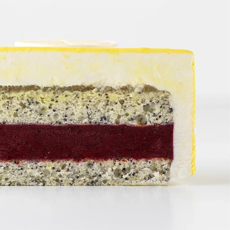 Освежающий лимонный мусс — крем, черничная начинка, сочный маковый бисквит на йогурте, лимонный гель.