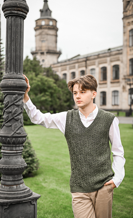 Безрукавка “Dragobrat” вяжется снизу вверх одной деталью круговым вязанием. На уровне проймы работа разделяется на детали переда и спинки, вязание которых заканчивается отдельно, плечевые швы выполняются методом «трех спиц». Размеры: 32-34; 34-36 (38-40; 40-42; 44-46) (48-50; 52-54; 56-58) Вам потребуется: — Yaka by Dye Dye Done (60% меринос, 20% шелк, 20% як; 366 м / 100 г) — спицы №№ 2.25 и 2.75 либо другого номера, позволяющего достичь указанную в описании плотность вязания. — маркеры для вязания, игла, 5 петледержателей или дополнительная нить.