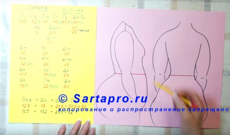 Видео урок по построению чертежа основы платья с коротким рукавом для фигуры с животом (плоским или круглым), который касается воображаемой вертикали спереди, с крутыми ягодицами, с «галифе» по бокам.