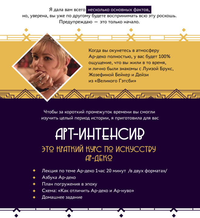 Когда вы окунетесь в атмосферу Ар-деко полностью, у вас будет 100% ощущение, что вы жили в то время, и лично были знакомы с Луизой Брукс, Жозефиной Бейкер и Дейзи из «Великого Гэтсби»
