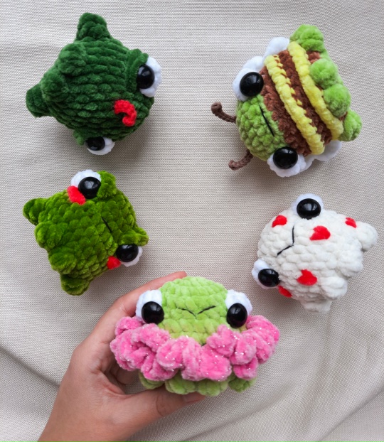 Рост готовой игрушки 6-7 см. Без пришивных деталей, если не считать глаза! Схема одна, но лягушек вы получите несколько — влюблённая, очень злая, Лягушка- подозревала, Лягушка- пчёлка и Лягушка цветок.