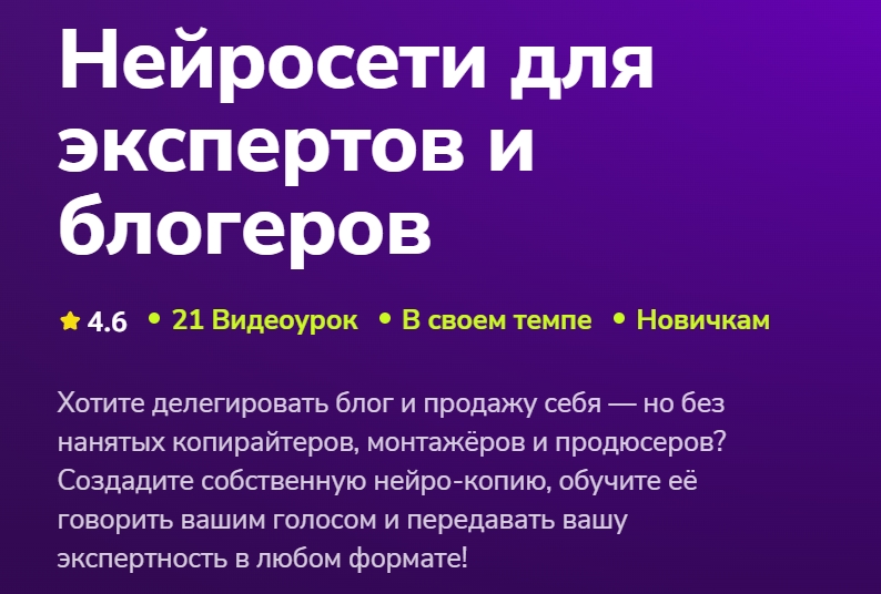 Курс Кирилла Калужских «Нейросети для экспертов и блогеров» — это 21 занятие, после которых у вас появится ваша нейро-копия: она пишет тексты вашим голосом, придумывает идеи, помогает с видео и даже оформляет презентации.