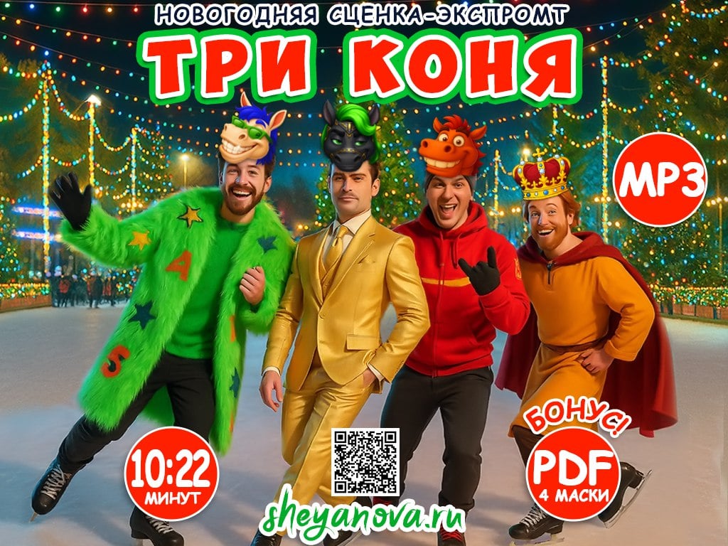 Специально к Новому году 2026 — Году Лошади! Это сказка новогодняя в духе «cмешные сказки для взрослых ру»: добродушный царь и три любимых коня — Тусовщик, Нормалёк и Гламур — устраивают ледовое соревнование. Получается короткая сказка прикол: Тусовщик «танцует на коньках», Нормалёк делает всё невозмутимо, Гламур эффектно выходит и столь же эффектно падает. Друзья закручивают общее шоу, царь объявляет дружескую ничью и поднимает тост за дружбу.