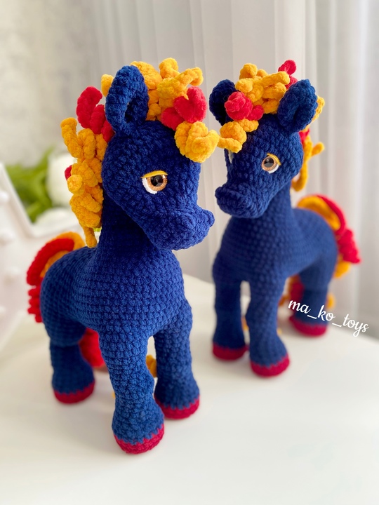Тело и голова вяжутся одной деталью, все ноги ввязываются. Пришиваются ушки, крепится грива и хвост