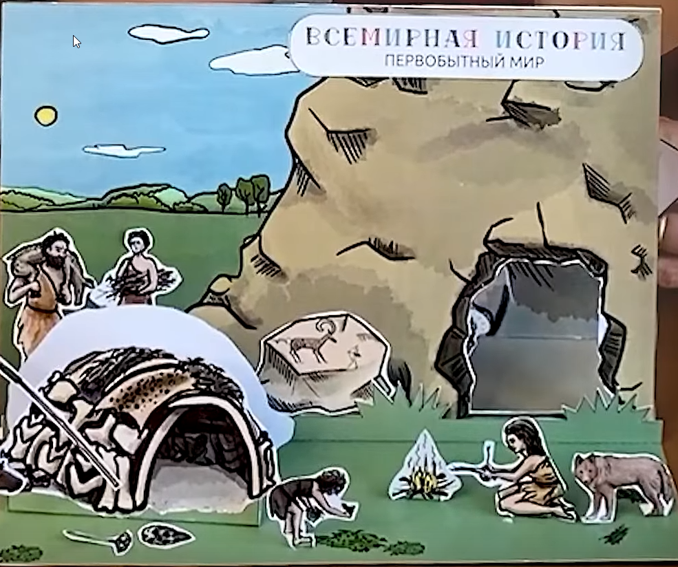 Первобытный мир для малышей — это один урок на 30 минут с большим красивым макетом пещеры. Этот урок для самых маленьких 5+, можно и 4+ попробовать — до школы будете к нему возвращаться, а то и дольше. С макетом можно играть, можно заламинировать животных и древнюю семью, дополнить пейзаж. В этом уроке мы кратко касаемся основных тем: что ели, где жили, во что одевались, какие использовали орудия и оружие, что рисовали и даже как посвящали мальчиков в охотники. Про собаку тоже не забыли.