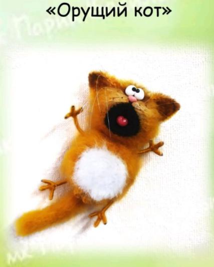 Забавная вязаная игрушка в виде кота с открытой пастью, изображающего громкое мяуканье. Дизайн отличается выразительной мимикой и яркой эмоциональностью.